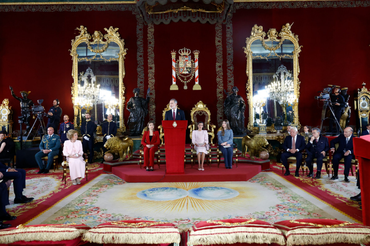El Rey, acompañado por Doña Letizia, la Princesa de Asturias y la Infanta Doña Sofía, presidió la ceremonia en el Salón del Trono. Previamente, fueron recibidos por la presidenta del Consejo de Administración del Patrimonio Nacional, Ana de la Cueva, y saludaron a altas autoridades del Estado en el Salón de Teniers, incluyendo al presidente del Gobierno, Pedro Sánchez, y a los presidentes de las Cámaras y de los Tribunales Supremo y Constitucional.