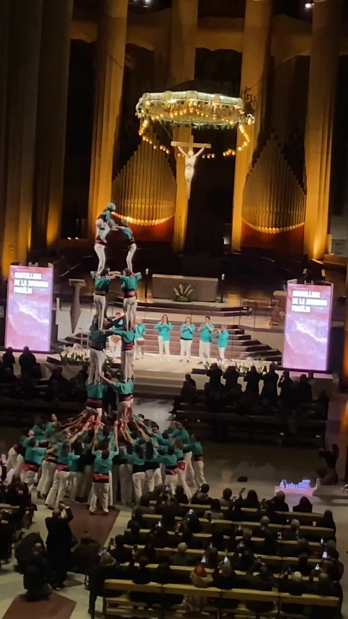 Rompiendo con la solemnidad habitual y en un gesto atípico para los actos litúrgicos del templo, aparecieron los castellers.