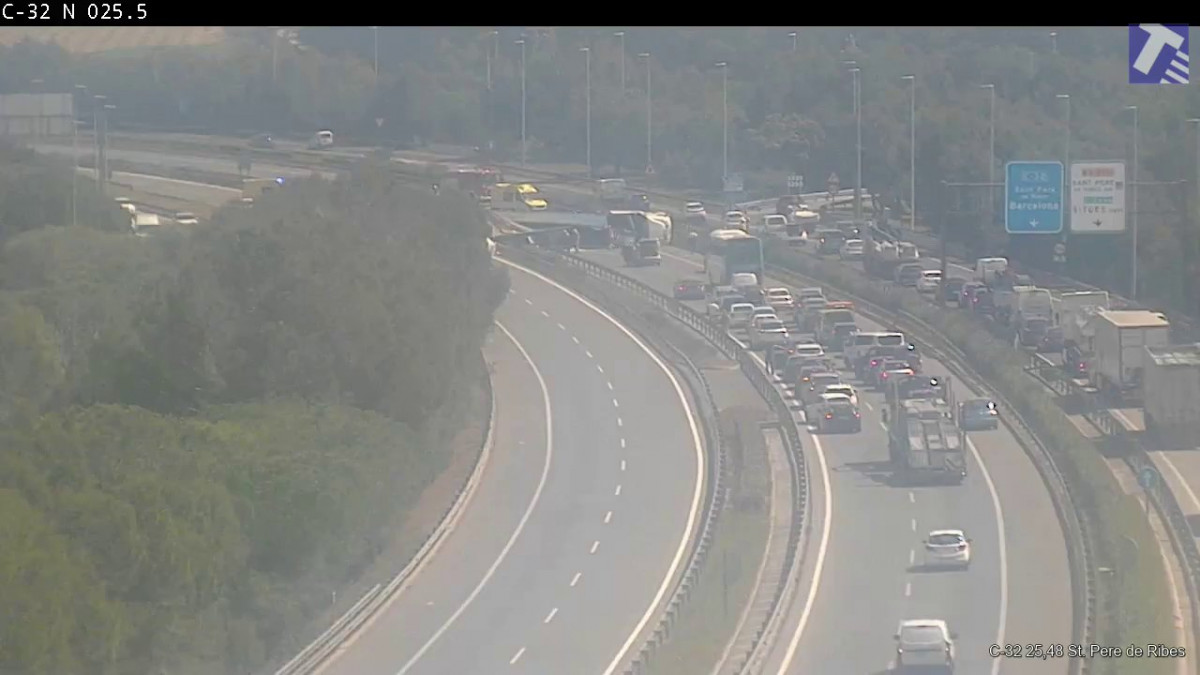 La circulación en la C-32 está completamente interrumpida en Sant Pere de Ribes después de que un camión volcara ocupando toda la calzada en sentido Barcelona. Además, la carga del vehículo ha caído en sentido Tarragona, complicando aún más la situación.