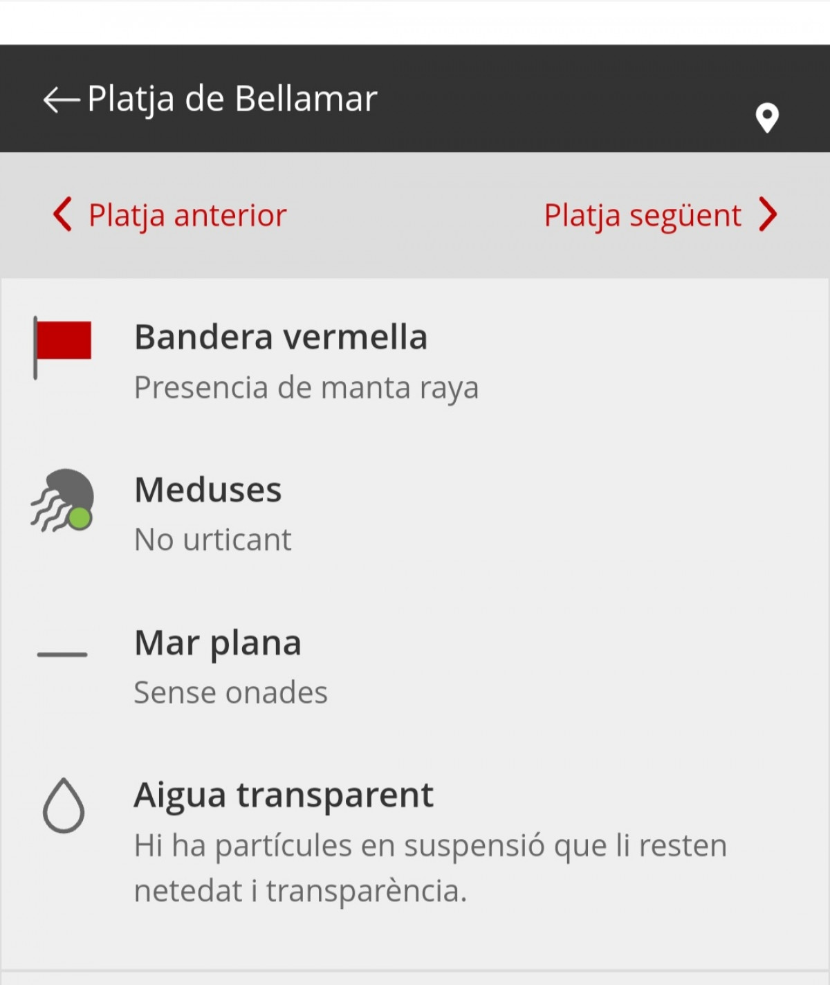La presencia de una manta raya cerca de la costa ha obligado este sábado a colgar la bandera roja en la playa de Bellamar de Premià de Mar (Barcelona), lo que prohíbe bañarse en el mar.
