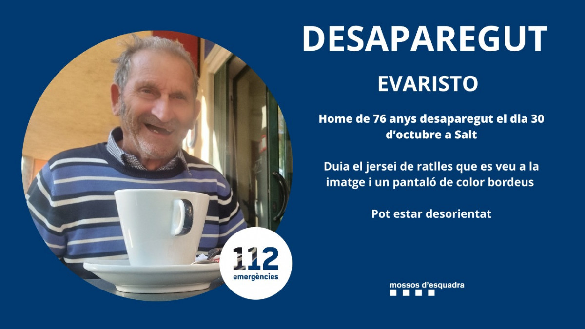 Los Mossos d'Esquadra han emitido una alerta para encontrar a Evaristo, un hombre de 76 años que desapareció el pasado 30 de octubre en el municipio de Salt, Girona. Hoy, cuando se cumplen cinco días de su desaparición, la policía catalana ha intensificado la búsqueda y ha pedido la colaboración de la ciudadanía para recabar cualquier información que pueda ayudar a localizarlo.