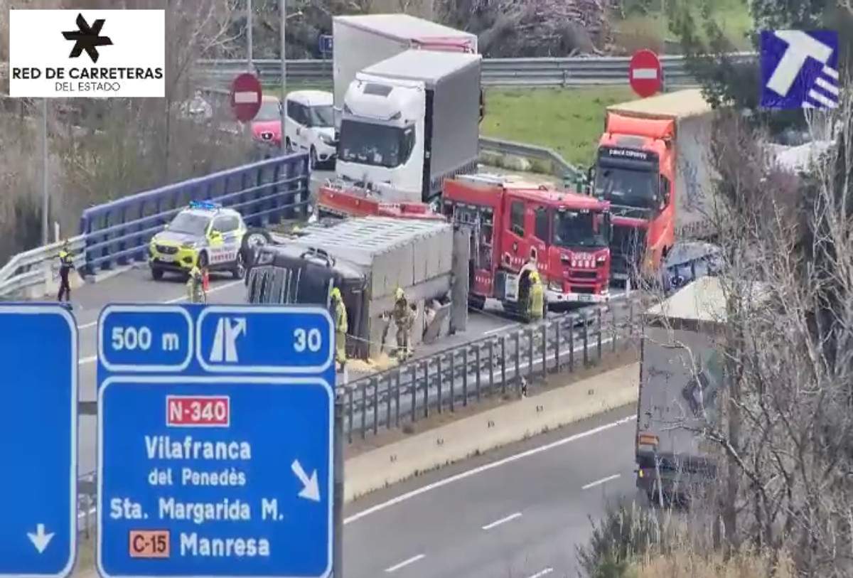 En el lugar del accidente trabajan los equipos de emergencias, incluyendo cuatro dotaciones de los Bomberos y tres unidades de los Mossos d'Esquadra. El camión volcado sufrió un derrame de gasóleo, que ya ha sido contenido por los bomberos. El conductor ha sido atendido por el Servicio de Emergencias Médicas (SEM).