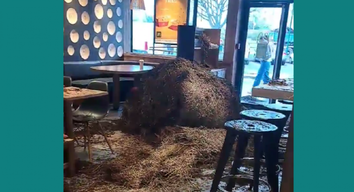 Los agricultores que se manifestaban arrojaron este martes por la mañana un fardo de paja en un restaurante McDonald's del municipio de Agen. En los vídeos, ampliamente difundidos en las redes sociales, se puede ver un fardo de paja aplastado en medio del restaurante y la paja esparcida por el suelo.