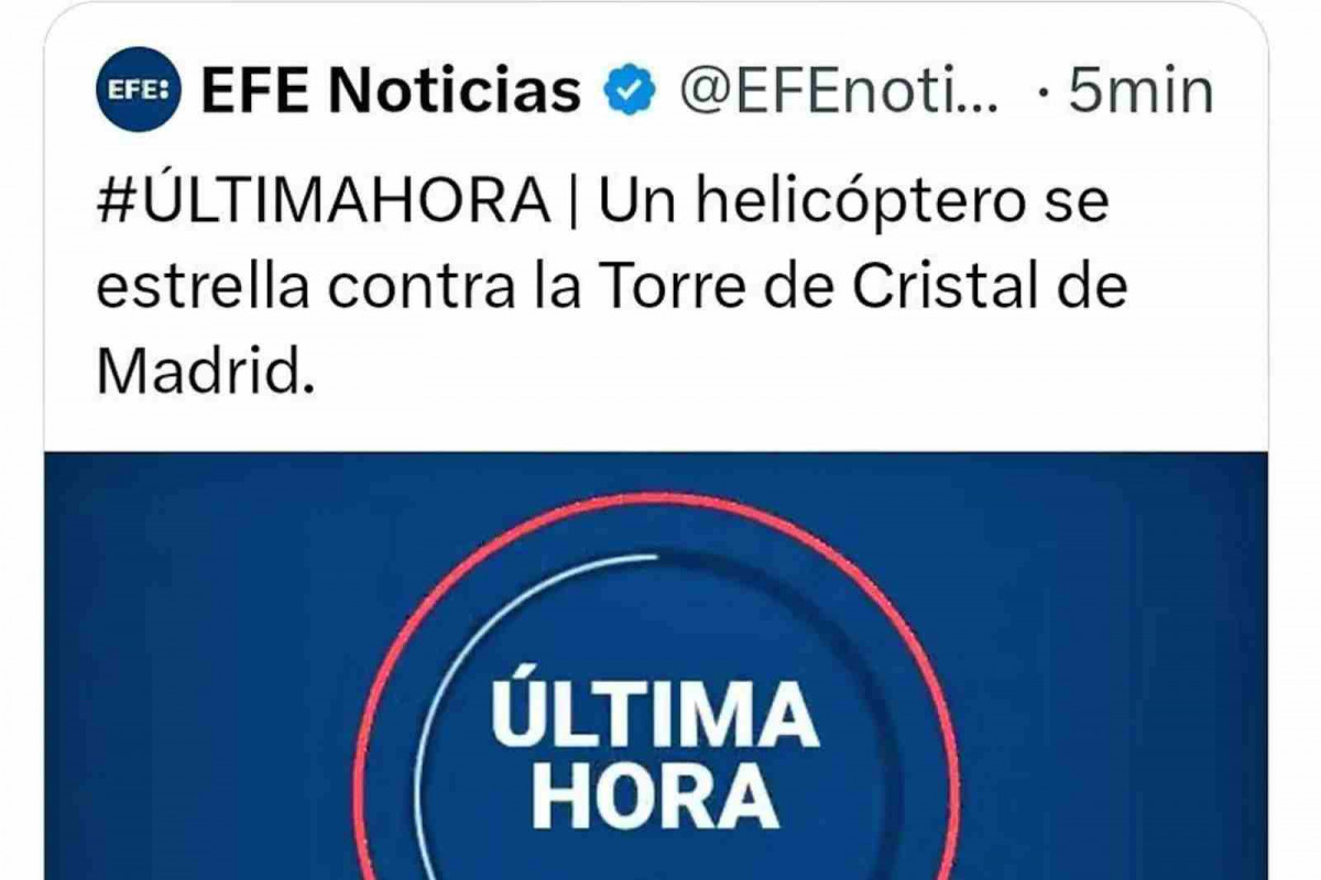 La Agencia Efe ha difundido por error una alerta sobre el supuesto accidente de un helicóptero en la Torre de Cristal de Madrid, un hecho que en realidad no ocurrió. La publicación, visible en la cuenta de Efe en la red social X, decía: "#ÚLTIMAHORA Un helicóptero se estrella contra la Torre de Cristal de Madrid".
