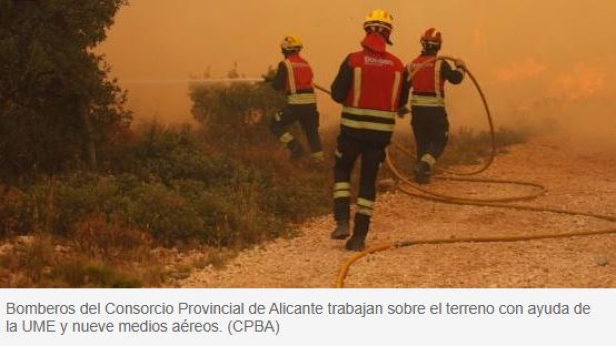 Los bomberos del Consorcio Provincial de Alicante, junto con la UME y un total de nueve medios aéreos, continúan desplegados sobre el terreno para intentar frenar el avance de las llamas y proteger uno de los entornos naturales más valiosos del interior alicantino.