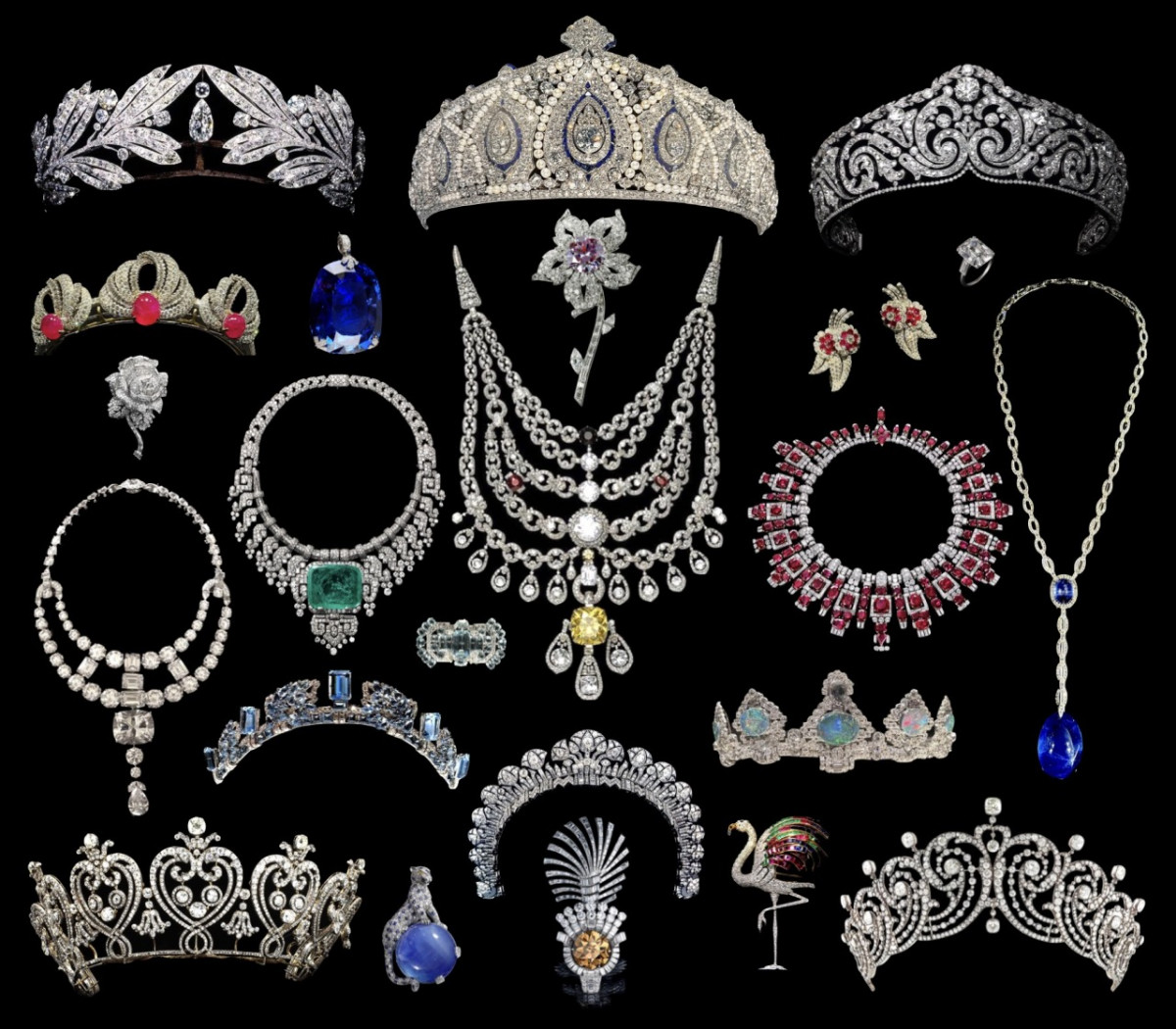 - Entre las piezas destacadas se encuentran el broche de diamante rosa Williamson, encargado por la reina Isabel II en 1953, el collar de serpiente articulado de María Félix y la tiara Scroll, usada por figuras como Rihanna.