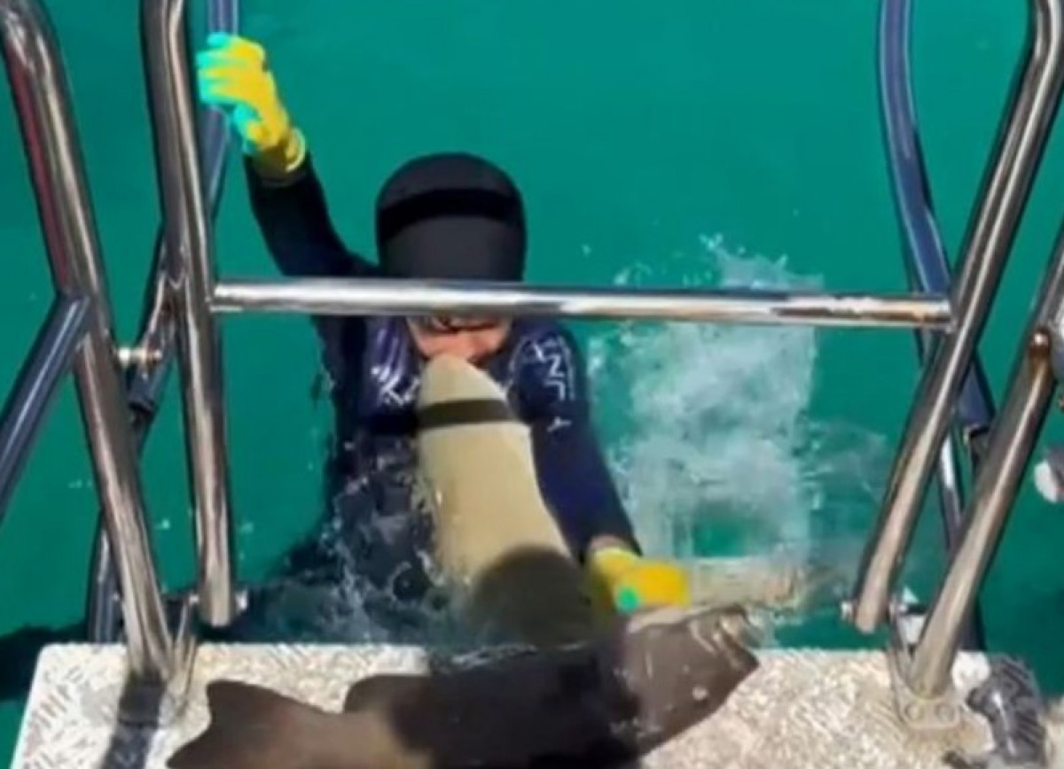Las imágenes en TikTok muestran al joven con traje de neopreno subiendo por las escaleras del barco, mostrando con orgullo su última captura, una trucha de coral, cuando un tiburón sale de debajo del bote y se lanza hacia su pecho y el área de la axila, dándole un pequeño mordisco.