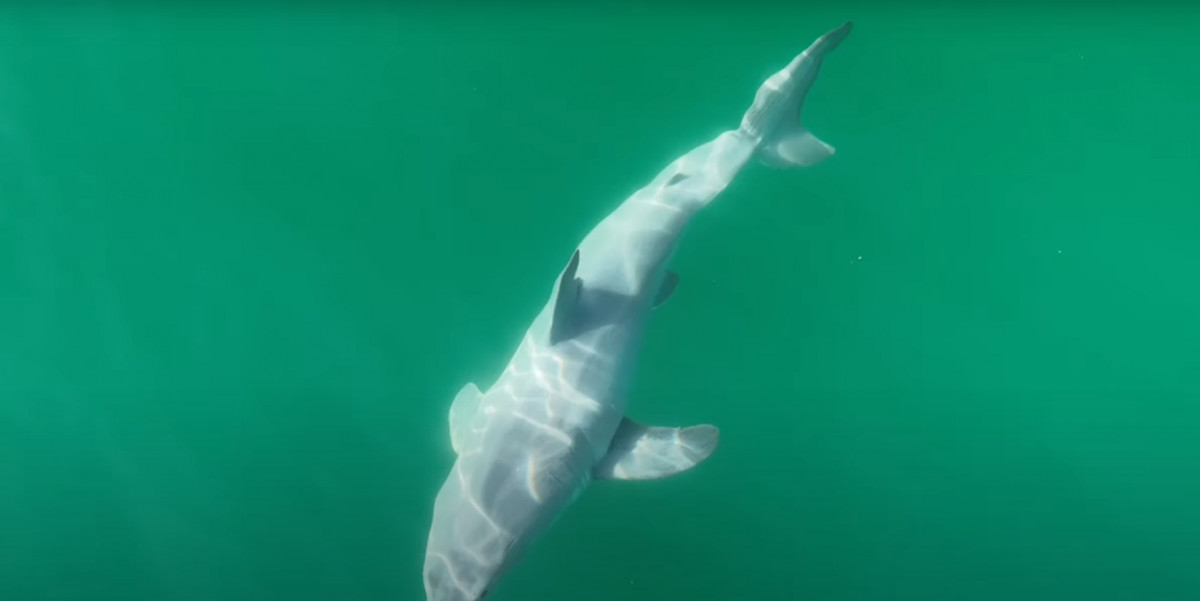 Los tiburones blancos son grises en la parte superior y blancos en la parte inferior. Pero este tiburón de aproximadamente 1,7 metros de largo era de un blanco puro.