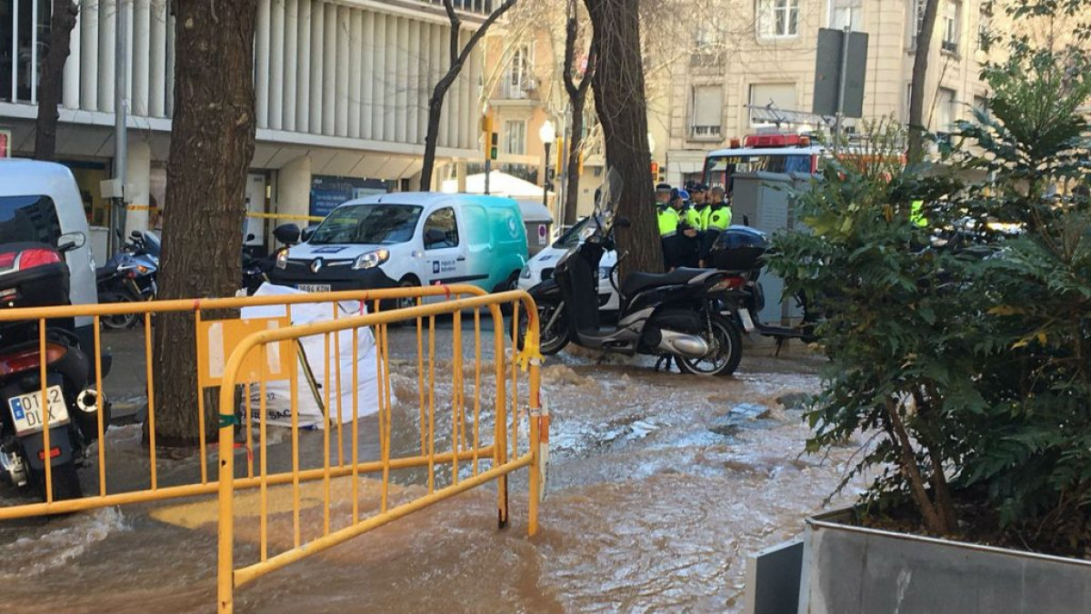 Aguas de Barcelona trabaja en la avería, que se ha producido en una tubería grande por la que circula el agua presurizada, por lo que se han vertido muchos litros de agua.