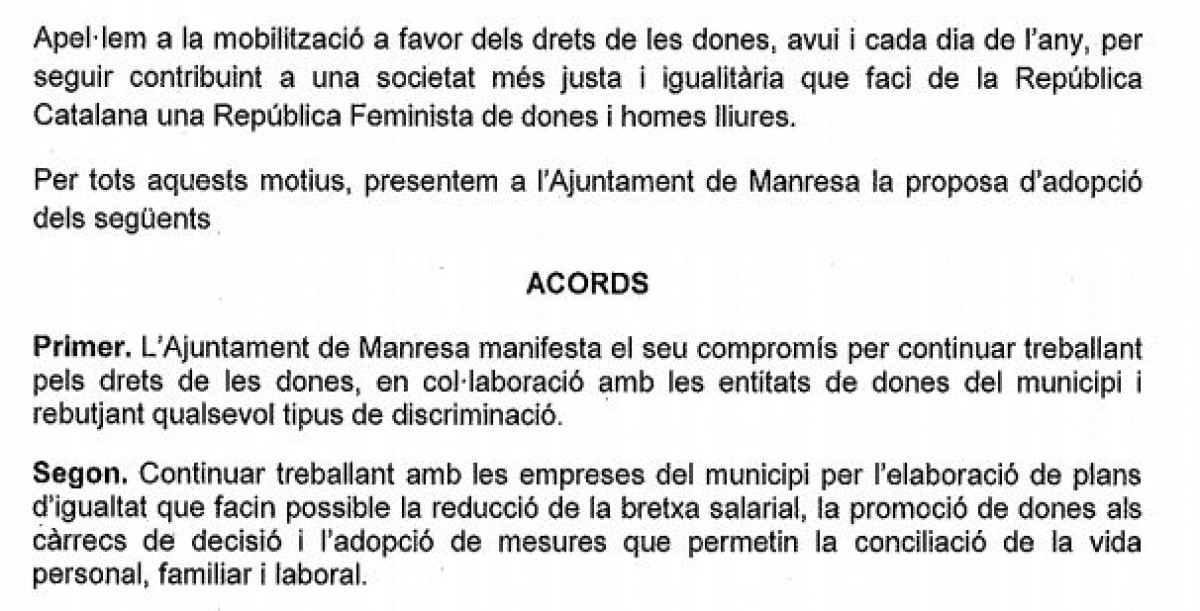 El grupo de Ciudadanos en el Ayuntamiento de Manresa ha apoyado una resolución, con motivo del Día de la Mujer el próximo 8 de marzo, en la que el consistorio insta a la movilización ciudadana para contribuir a una “sociedad más justa e igualitaria que haga de la República Catalana una República Femenina de mujeres y hombres libres”.