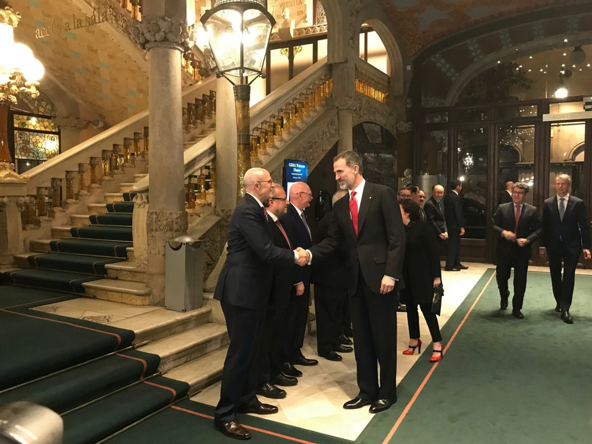 El Rey ha llegado al Palau de la Música con la vicepresidenta del Gobierno, Soraya Sáenz de Santamaría, y lo han recibido el ministro de Industria, Turismo y Agenda Digital, Álvaro Nadal; el delegado del Gobierno en Catalunya, Enric Millo, y el director general de GSMA, Mats Granryd.