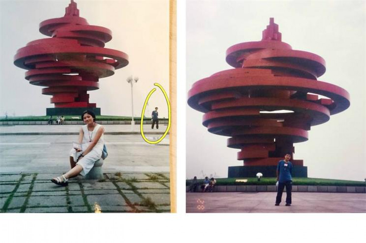 Xue y Ye, casados hace siete años y con dos hijas, descubrieron que ya se habían cruzado 11 años antes de haberse conocido gracias a una fotografía hecha frente a un monumento en la Plaza 4 de mayo, en Qingdao, China.