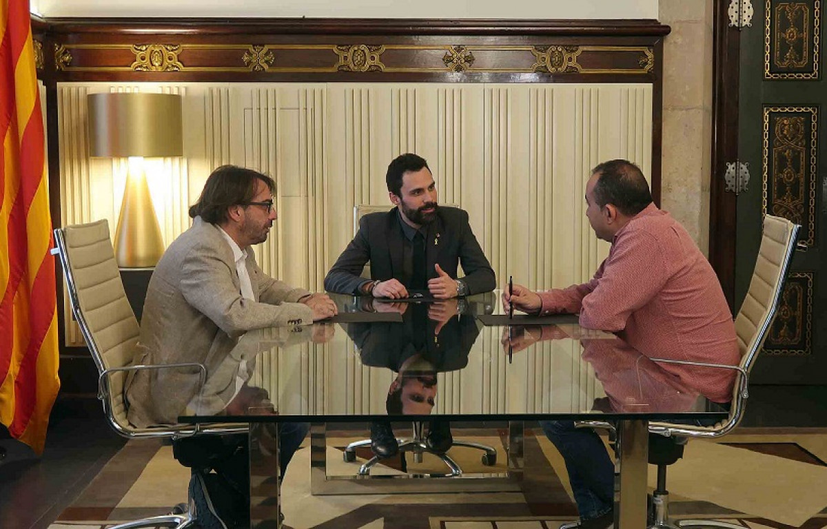 Los secretarios generales de CC.OO. y UGT de Catalunya, Javier Pacheco y Camil Ros, respectivamente, han pedido recuperar las instituciones catalanas en una reunión este lunes con el presidente del Parlament, Roger Torrent.