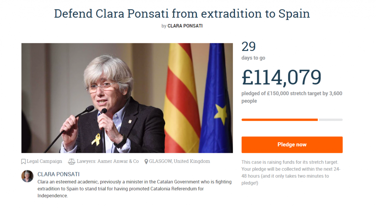 Ponsatí, que se ha entregado este miércoles a las autoridades escocesas a raíz de la euroorden de detención emitida por el Tribunal Supremo, ha puesto en marcha la campaña en Internet para lograr de forma "urgente" 40.000 libras para sufragar su defensa, que ha logrado en poco tiempo, por lo que ha aumentado a 100.000 libras la petición.
