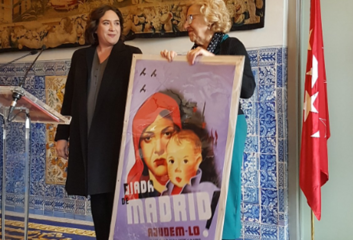 Este martes, Colau ha asistido en Madrid a la presentación de la exposición No pasarán, 16 días en Madrid de 1936', donde se ha emocionado y entregado un cartel de la época a la regidora de Madrid, Manuela Carmena.
