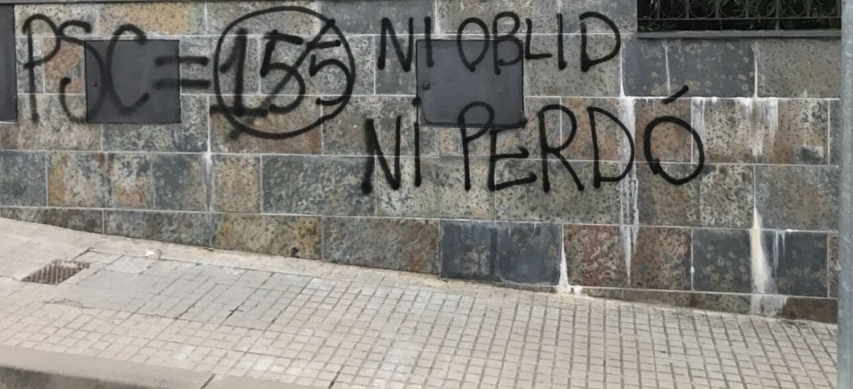 Las pintadas, reivindicadas por los Comités de Defensa de la República, identificaban al PSC con la aplicación del artículo 155 de la Constitución en Catalunya. "Ni olvido ni perdón" por el apoyo de los socialistas a la aplicación del 155, avisan los CDR, que se definen como "ni pasivos ni terroristas: empoderados".