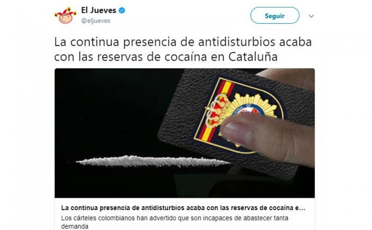 En el texto se afirmaba: "los antidisturbios han acabado con toda la cocaína de Catalunya", tras la actuación de los policías el 1-O.