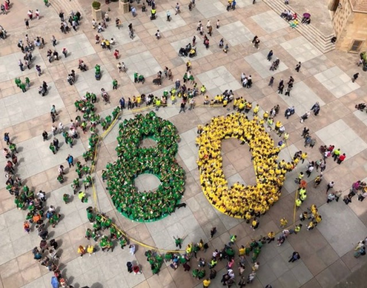 El número 80 formado por personas con los colores de la entidad (ONCE Cataluña)
