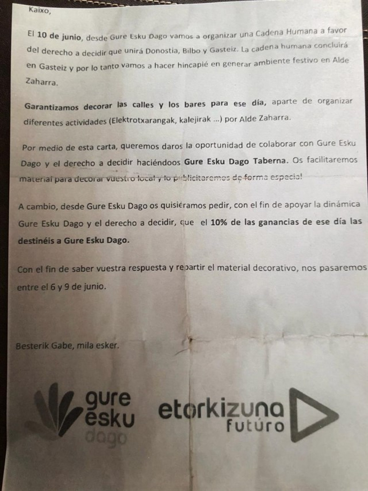 "A cambio, os quisiéramos pedir, con el fin de apoyar el derecho a decidir, que el 10% de las ganancias de ese día (10 de junio) lo destinéis a Gure Esku Dago", continúa el texto de la misiva.