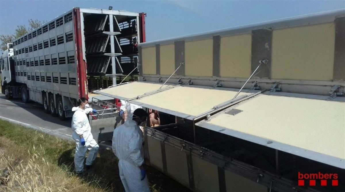 Tres dotaciones de bomberos se han desplazado al punto del accidente en la C-241d , además de veterinarios y otro camión para hacer el traspaso de los animales a otro vehículo.