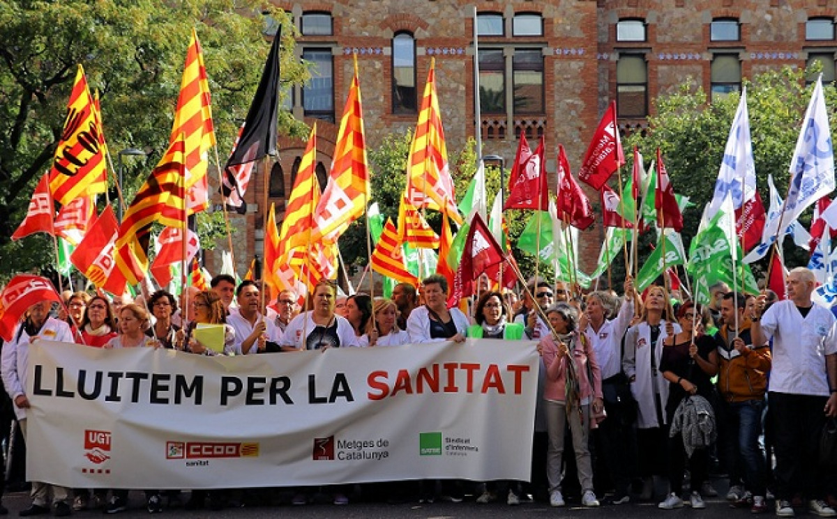 Integrantes de CC.OO., UGT, Metges de Cataluntya y Satse reclaman un incremento del 1,95% del salario que se aprobó en la mesa de la Función Púbica, así como la recuperación de la retribución del 100% de las bajas.