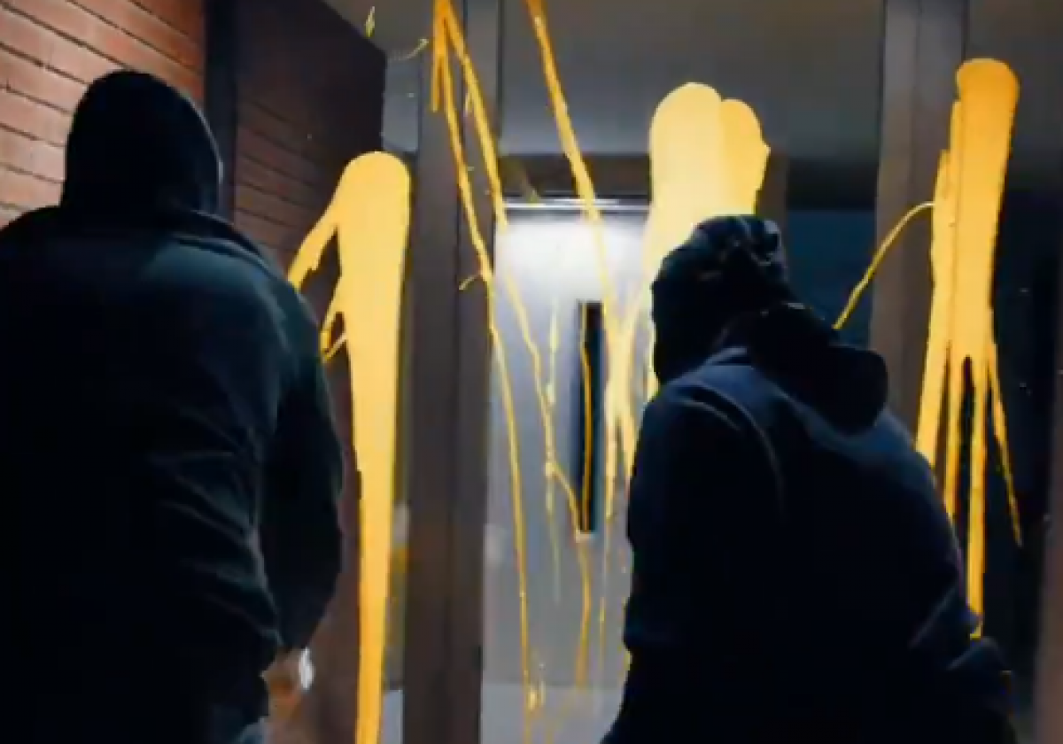 En el vídeo, la organización juvenil revela la dirección de Llarena y muestra como dos encapuchados lanzan pintura amarilla a las puertas del domicilio en Sant Cugat.