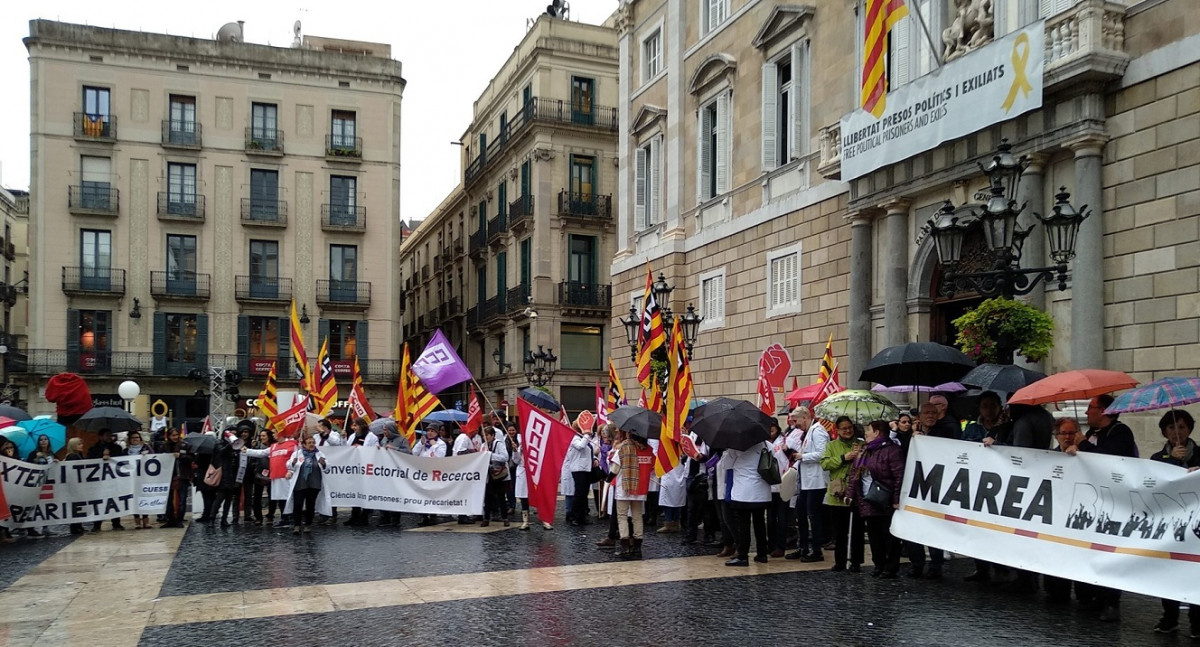 Trabajadores de todos los sectores de la sanidad, la dependencia y la investigación en Catalunya y plataformas de usuarios se han concentrado la mañana de este viernes en la plaza Sant Jaume de Barcelona, ante la Generalitat, convocados por CC.OO. y Marea Blanca para protestar por el deterioro del sistema público desde el inicio de los recortes y reclamar más recursos.