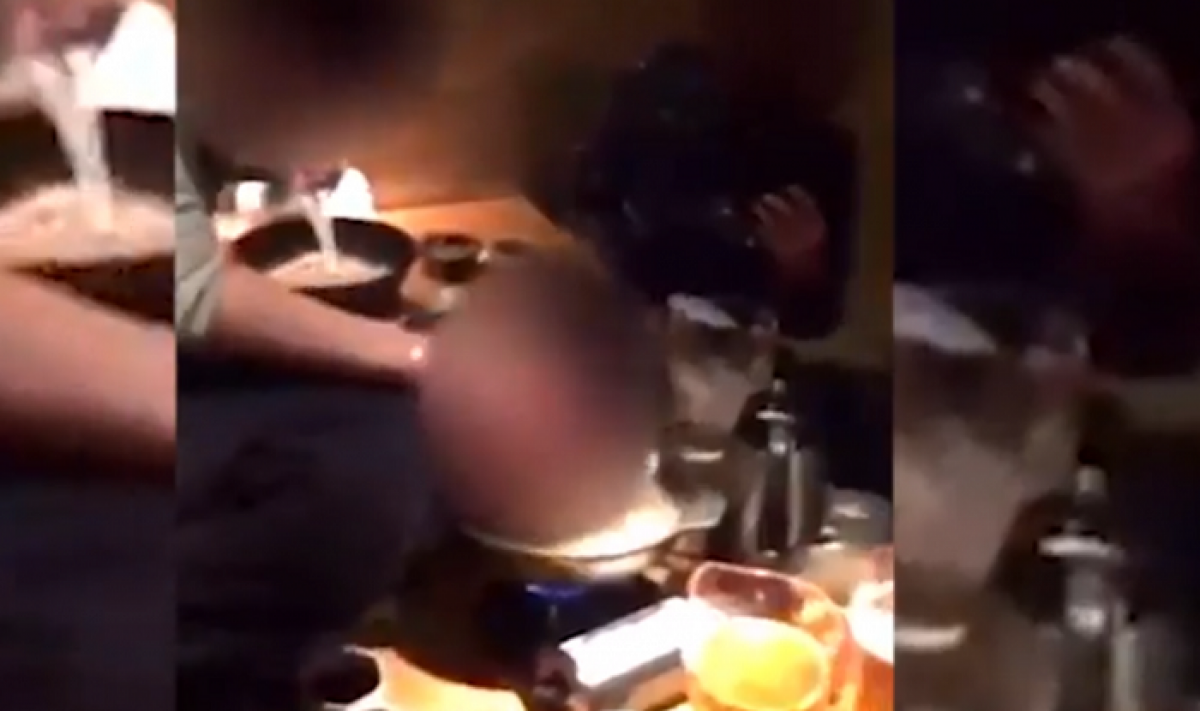 El video del incidente tomado por dos teléfonos móviles muestra a un grupo de personas en un restaurante de Tokio alrededor de una mesa con comida y jarras de cerveza.