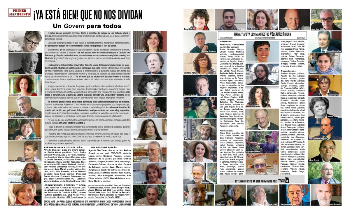 El manifiesto 'Que no nos dividan', promovido por Recortes Cero, reclama a las fuerzas que sostienen al actual Govern que designen un nuevo presidente.