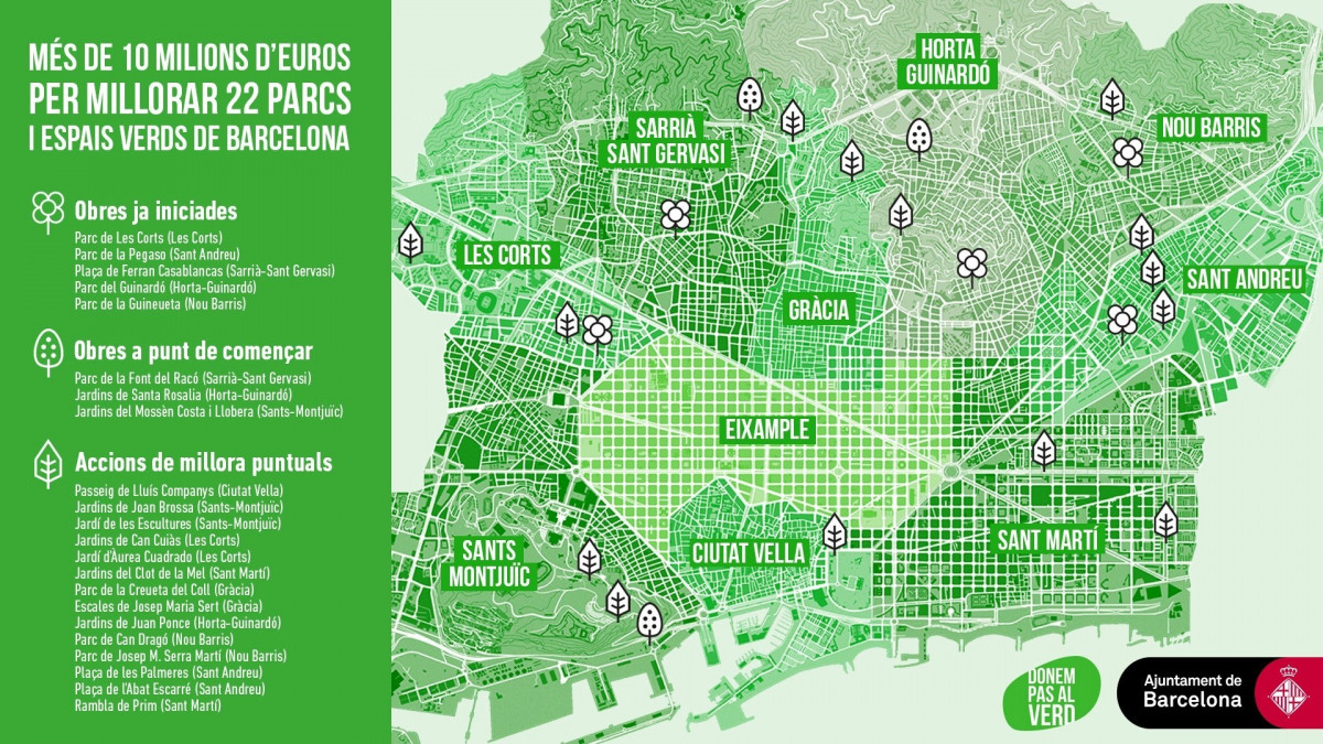 Las obras que ya están en marcha son las de los parques de Les Corts, de la Pegaso, del Guinardó y de la Guineueta, y la plaza Ferran Casablancas; y próximamente empezarán las obras del parque de la Font del Racó, los jardines Santa Rosalia y los de Costa i Llobera, según un comunicado del Ayuntamiento.