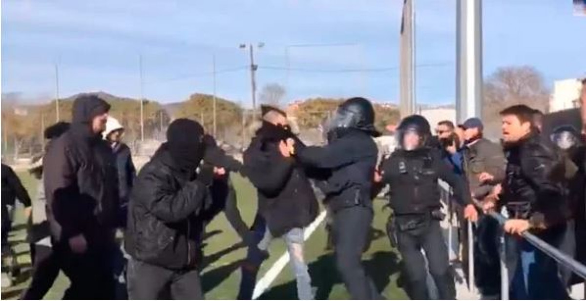 Los Mossos d'Esquadra han intervenido este mediodía con cargas puntuales en el campo de fútbol de L'Hospitalet para separar a miembros de los dos grupos, tras lo que dos agentes han resultado heridos leves, con contusiones, ha informado la policía catalana.