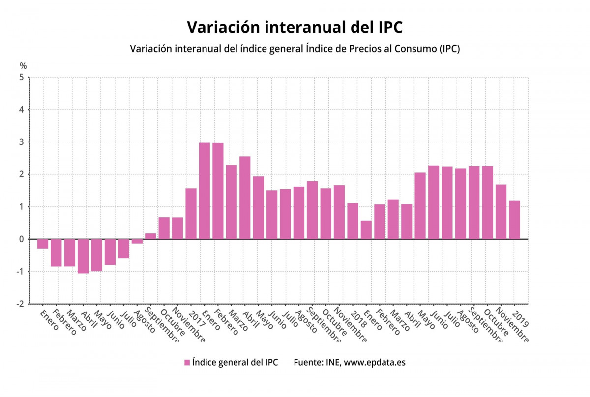 La tasa interanual de diciembre es la vigésimo octava tasa positiva que encadena el IPC interanual e implica que los precios son hoy un 1,2% superiores a los de hace un año.