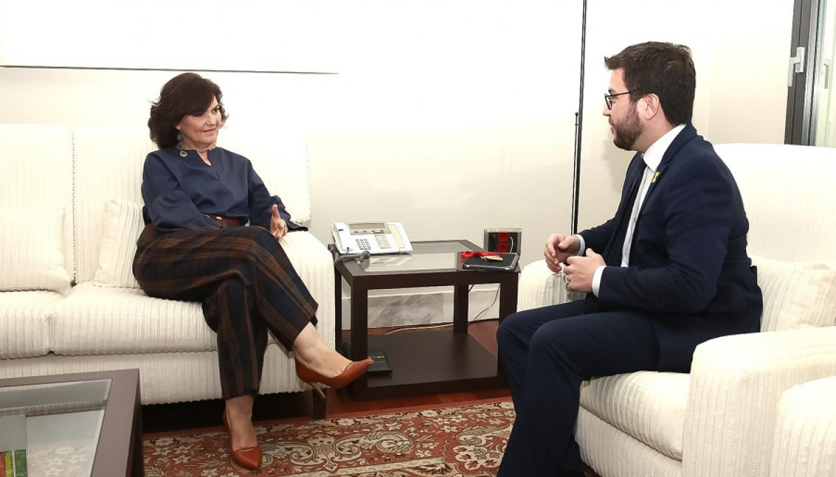 La vicepresidenta del Gobierno, Carmen Calvo; el vicepresidente del Govern, Pere Aragonès, y la consellera de Presidencia, Elsa Artadi, se han reunido este viernes en la sede de la Conselleria de Economía de la Generalitat en un "clima constructivo", han explicado fuentes de la Generalitat.