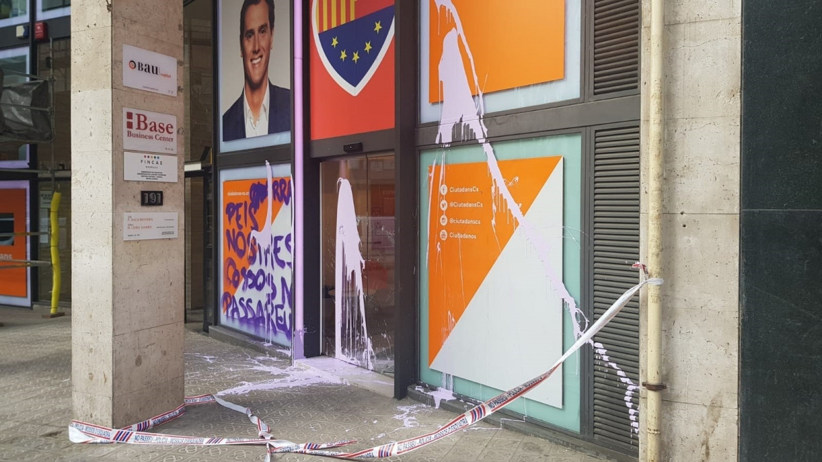 La líder del partido en Catalunya, Inés Arrimadas, ha lamentado que "los fascistas vuelven a atacar la sede de Cs en Barcelona rompiendo cristales, haciendo pintadas y lanzando pintura".