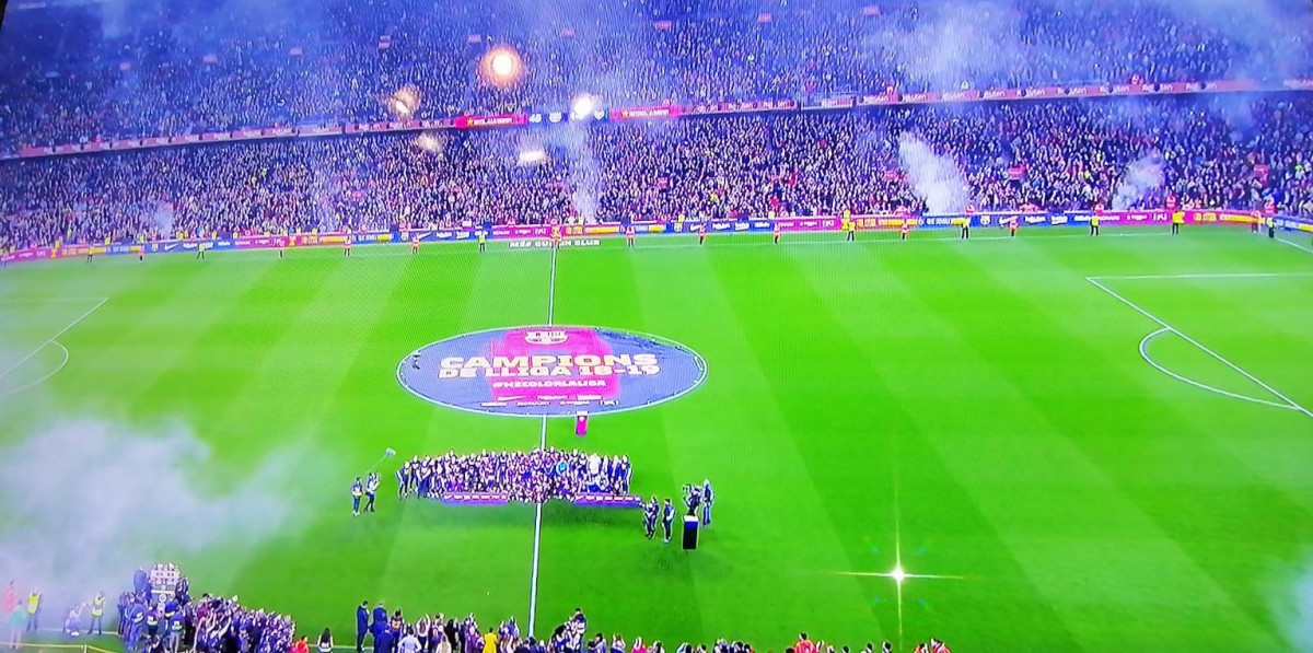 Al ritmo de ‘Campeones, Campeones’ el Camp Nou empezó a festejar el título de liga –tímidamente- a pocos minutos del final del encuentro, pues el resultado del partido, pese al control evidente del Barcelona, era de 1-0.