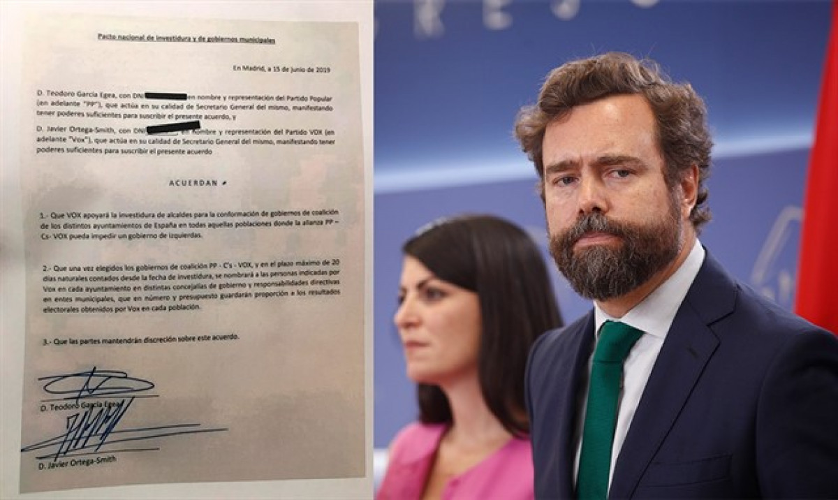 En ese texto, firmado por los secretarios generales del PP, Teodoro García Egea, y de Vox, Javier Ortega Smith, se indica que el partido tachado de ultraderecha apoyará a los candidatos de PP y Ciudadanos en los municipios donde se pueda desalojar a la izquierda de las alcaldías, y a cambio, en el plazo máximo de 20 días, "se nombrará a las personas indicadas por Vox en cada ayuntamiento en distintas concejalías de gobierno y responsabilidades directivas en entes municipales, que en número y presupuesto guardarán proporción a los resultados electorales obtenidos por Vox en cada población".