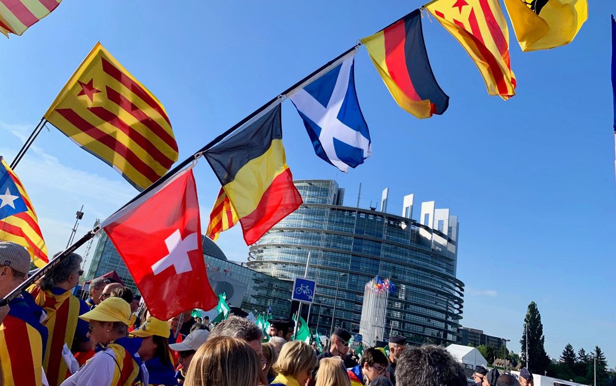 El independentismo se ha manifestado este martes en Estrasburgo (Francia), el día en el que se constituye el Parlamento Europeo tras las elecciones del 26 de mayo, donde finalmente no han acudido ni el expresidente de la Generalitat Carles Puigdemont y el exconseller Toni Comín, pese a que amenazaron con acudir para ocupar dos escaños.