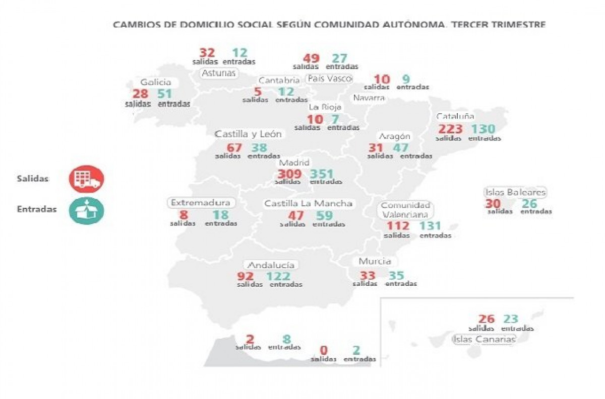 Por su parte, Madrid resta 471 millones de euros y es la comunidad autónoma donde más empresas salen en el tercer trimestre (309) y también a la que más empresas llegan, con un total de 351, lo que hace que tenga mayor saldo positivo (42). La facturación de las compañías que llegan arrojan una diferencia positiva de 314 millones de euros, la más elevada este trimestre, seguido de los 106 millones de Catalunya. En el lado contrario se encuentra la Comunidad Valenciana, que representa un saldo negativo de 257 millones de euros.