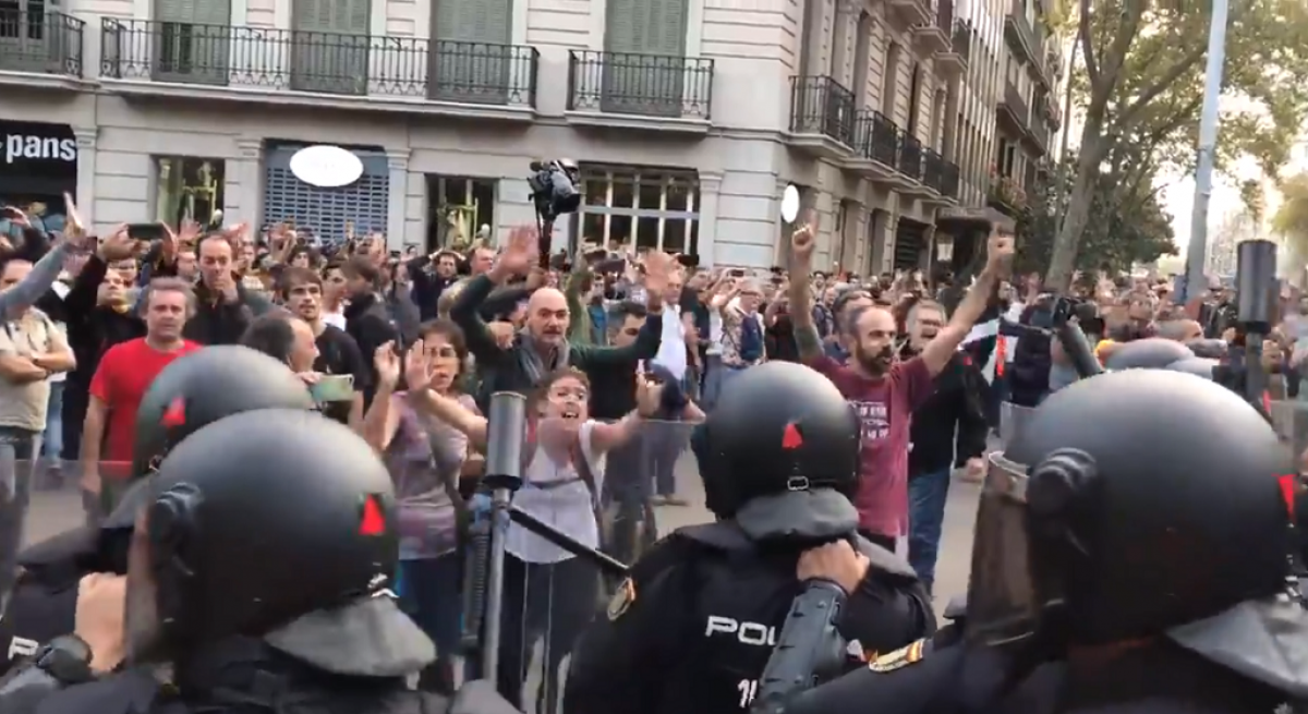 Paralelamente, pasadas las 20.30 horas continuaban concentrados en Urquinaona en su confluencia con la Via Laietana, donde hay un cordón policial para impedir que se acerquen a la Jefatura de Policía.