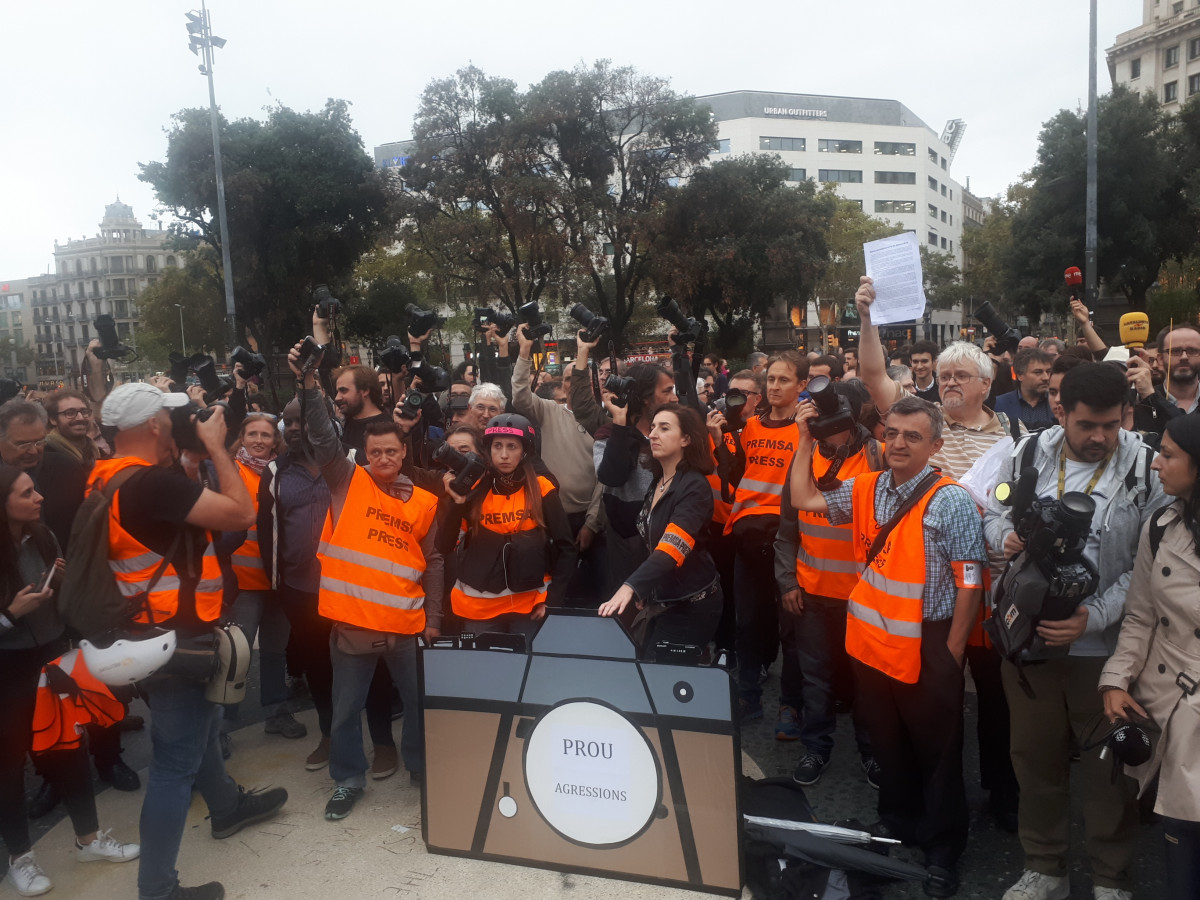 Unos 200 periodistas se han concentrado la tarde de este martes en el centro de la plaza Catalunya de Barcelona para reclamar el fin de las agresiones a los profesionales de la información en los últimos días.