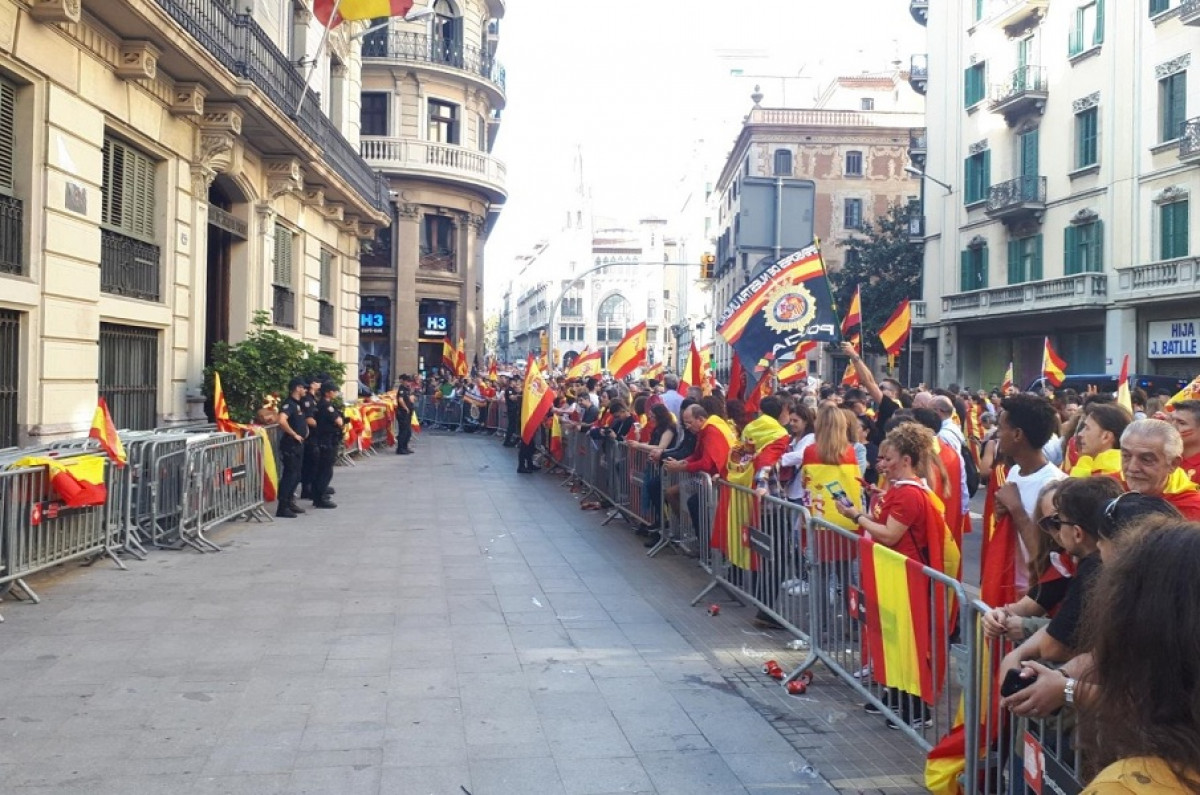 La concentración se ha producido después de que algunos salieran de la manifestación que había convocado a mediodía Societat Civil Catalana (SCC) en el paseo de Gràcia y la plaza Catalunya (cercana a la Jefatura).