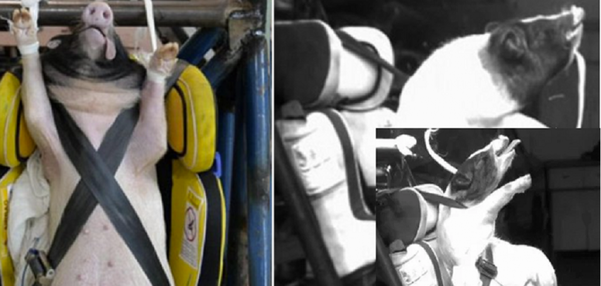 Se trataba de determinar los daños causados por un choque a 48 km/h a un niño de 6 años. Y en lugar de los maniquíes, los científicos chinos decidieron sentar a cerdos, asegurados con el cinturón, en los asientos infantiles a bordo de los vehículos.