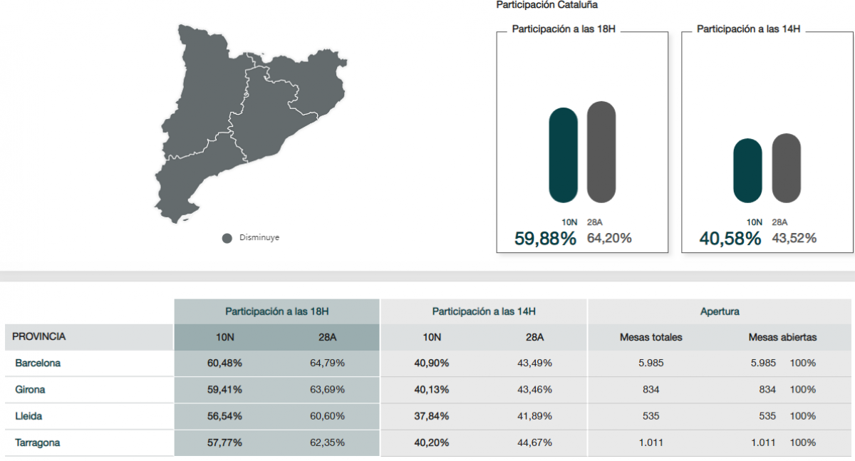 En la provincia de Barcelona el 28 de abril ha votado el 70,61% frente al 75,02% de este 10 de noviembre, un 4,41% menos. Mientras que en Girona ha votado el 71,41% frente al 73,53% de los aneriores comicios. En Lleida ha votado el 68,66% frente al 72,18% y en Tarragona el 68,74% frente al 73,59% de hace seis meses.