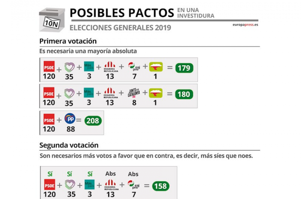 Sánchez también tendría posibilidad de retener el poder, siendo investido en segunda vuelta -para lo que sólo requeriría más síes que noes-, si alcanzara un acuerdo únicamente con Unidas Podemos y Más País, ya que entre los tres llegarían a los 162 votos.