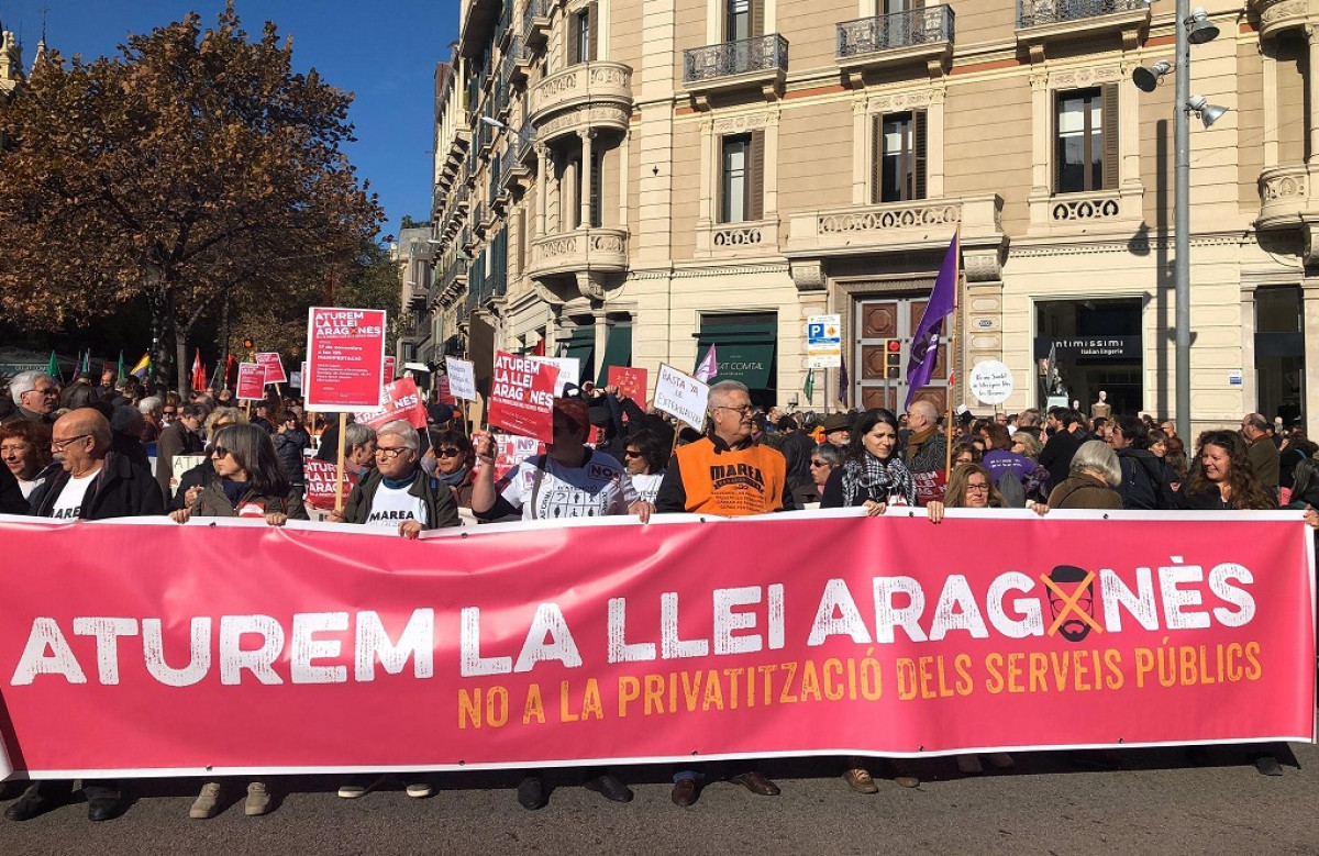 Unas 2.500 personas, según la Guardia Urbana, se han manifestado este domingo en el centro de Barcelona contra el Proyecto de ley de contratos de servicios a las personas que prepara la Generalitat ('Ley Aragonès') al considerar que "privatiza servicios públicos" externalizando su gestión hacia empresas privadas no sometidas a escrutinio público.