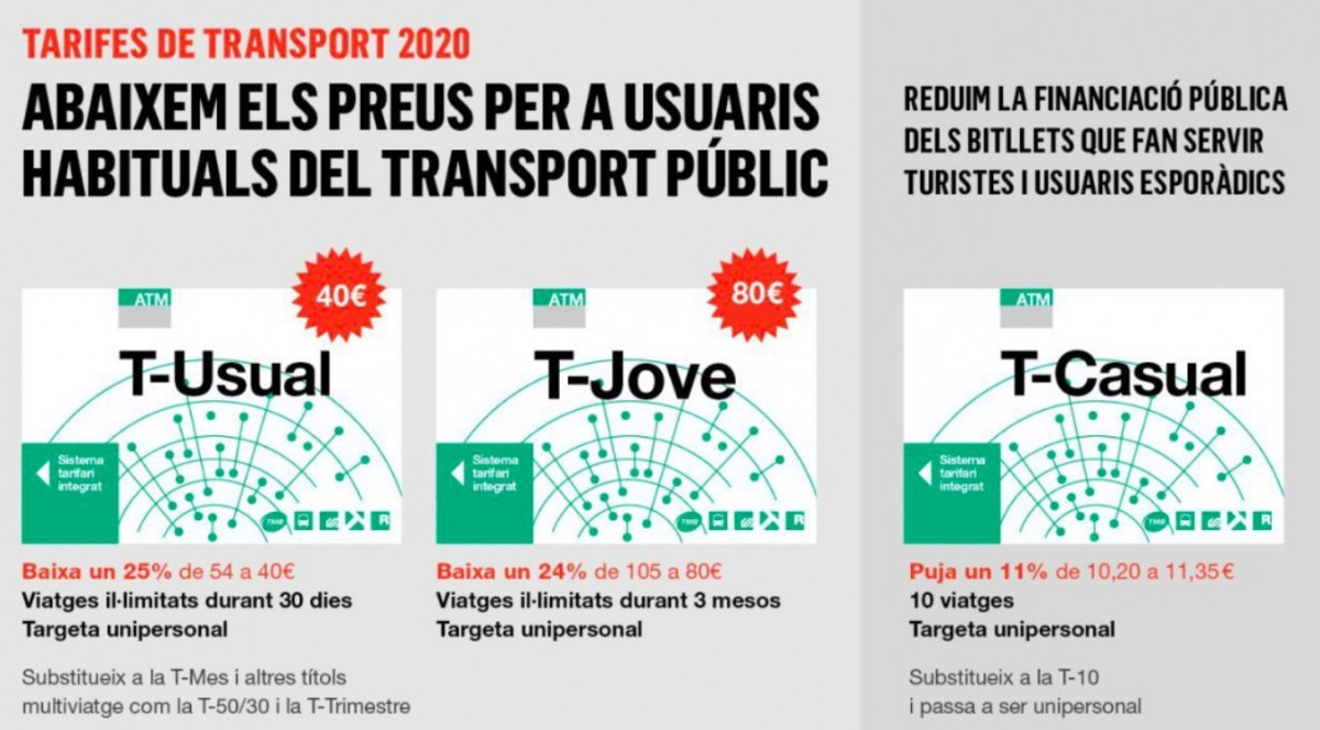 La Generalitat, el Ayuntamiento de Barcelona y el Àrea Metropolitana de Barcelona (AMB) han acordado un cambio de modelo tarifario en el transporte público para el 2020 que simplifica la gama de títulos e incorpora la T-Casual, que sustituirá a la tarjeta T-10 por un precio más elevado y de carácter unipersonal, y rebaja el título mensual con una tarifa plana.