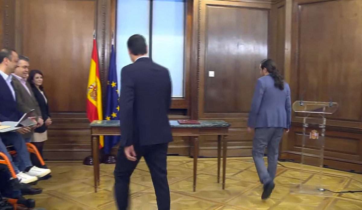 Mientras Pedro Sánchez y Pablo Iglesias se lanzaban piropos durante la presentación del acuerdo para un Gobierno de coalición entre el PSOE y Unidas Podemos, una veintena de informadores han expresado su protesta ante la imposibilidad de acceder a la sala -conocida como sala Chimenea- en la que Sánchez e Iglesias han presentado su programa de gobierno.