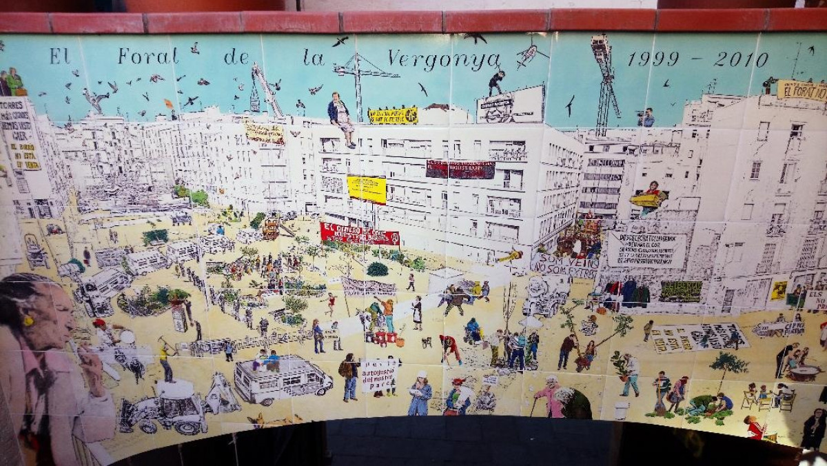 Nos han convocado para informar de las líneas generales de los espectáculos previstos hasta el verano, pero antes de entrar en la sala y dar paso al acto propiamente dicho permanecemos en esa misma terraza con una representación vecinal para asistir a la presentación del mural 'El forat de la vergonya 1999-2016', que ha creado el cartelista Peyo y que está basado en una fotografía de 360º hecha desde el balcón de una casa particular del barrio. Con esta obra se trata de expresar el rechazo de los vecinos por la creciente especulación a la que está sometida esta zona de la ciudad y la persistente amenaza de desahucios que sufren personas que han pasado toda la vida en la misma vivienda. Todo empezó cuando corrió la noticia de que se iba a utilizar cierto espacio para la construcción de un aparcamiento y se despertó el espontáneo rechazo del vecindario que trató de hacer llegar al Ayuntamiento su opinión."Pedimos -se dijo en el transcurso del acto- que no se nos criminalice al barrio y que se nos deje vivir en paz, como siempre hemos hecho". Un grito de auxilio que queda ahora inmortalizado en esta obra de Peyo.