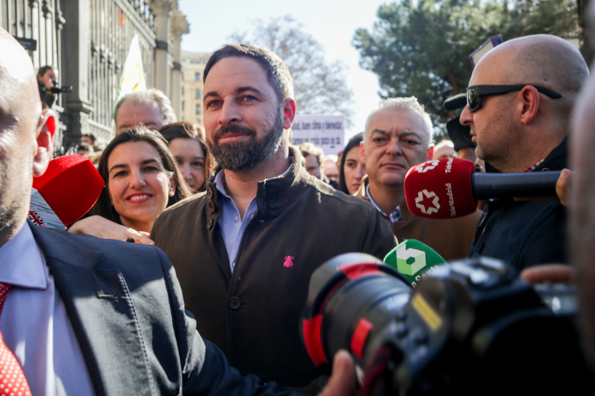 Abascal ha acudido junto a la presidenta de Vox Madrid, Rocío Monasterio, y el portavoz de la formación en el Congreso de los Diputados, Iván Espinosa de los Monteros, a la concentración para ilustrar su apoyo al sector de la agricultura.