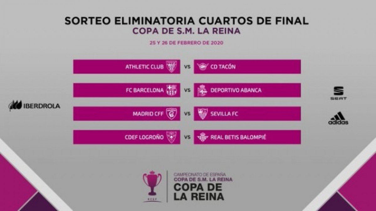 Barça-Deportivo, Athletic-Tacó, Madrid-Sevilla y Logroño-Betis serán las eliminatorias de cuartos de final de la Copa de la Reina de fútbol.